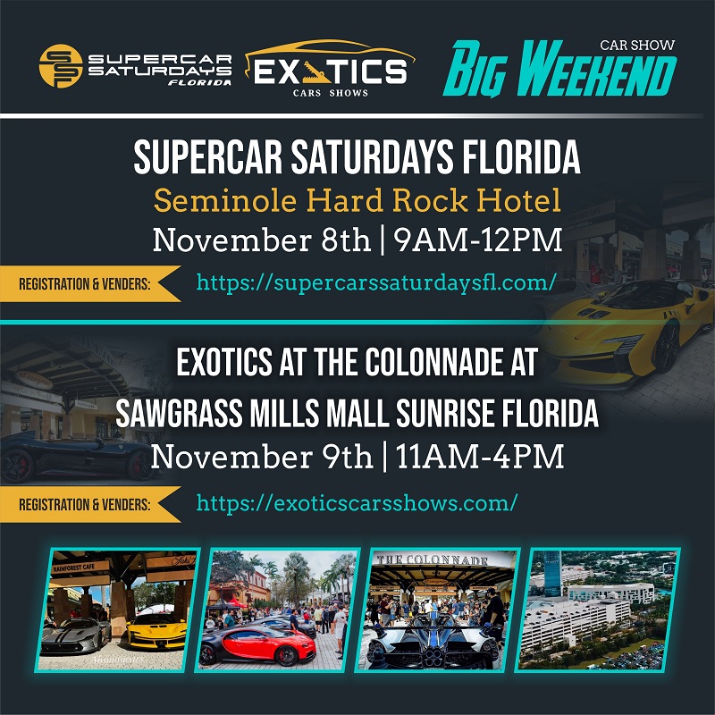 The weekend begins with Supercar Saturdays Florida at the Seminole Hard Rock Hotel & Casino on Saturday, November 8 (9 AM – 12 PM), followed by a private lunch for participating drivers and vendors.