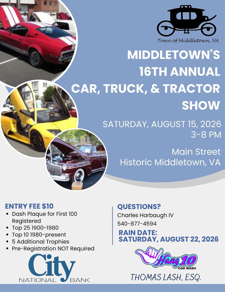 The largest car show in the Shenandoah Valley featuring 400 cars, it's 16th Annual Middletown Car, Truck & Tractor Show returns to Historic Main Street in Middletown on Saturday, August 15th from 3:00 PM – 8:00 PM (Rain Date: Saturday, August 22nd, 3:00 PM – 8:00 PM).