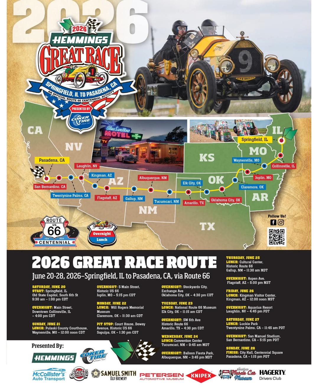 6-20 IL 6-21 MO 6-22 OK 6-23 OK -TX 6-24 NM 6-25 NM-AZ 6-26-AZ-NV 6-27-CA Great Race 2026